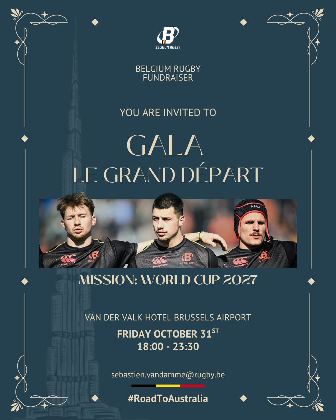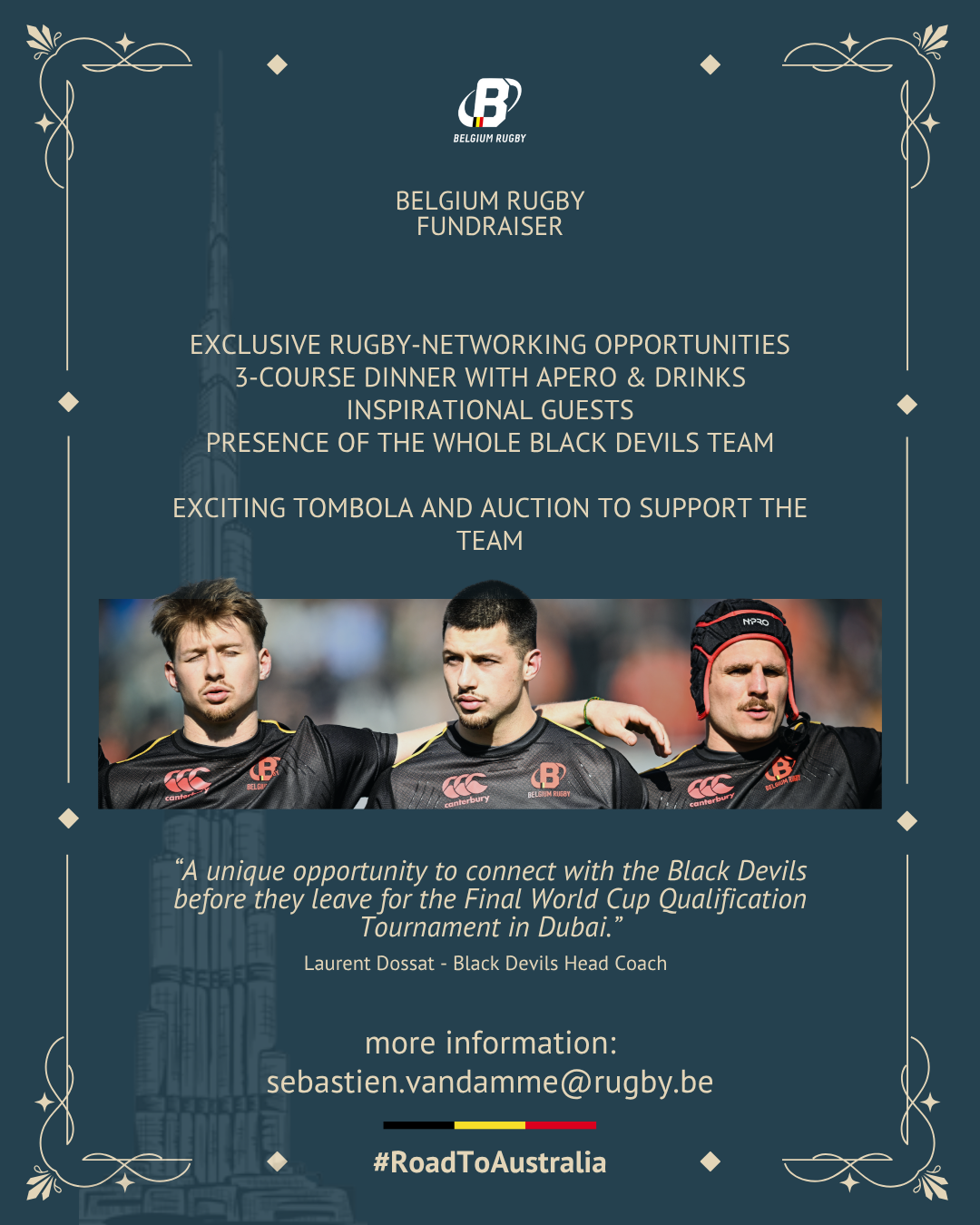 Belgium Rugby organise une levée de fonds en l’honneur des Black Devils et de leur tournoi qualificatif à Dubaï. La soirée à lieu au Van Der Valk Hotel Brussels Airport le 31/10/2025 à 18h.